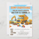 Fun cartoon "Dump Everything" construction birthday invitation features smiling yellow dump truck dumping colorful rocks, googly-eyed excavators, bulldozers, and construction site details. Perfect boys truck party invite, heavy machinery theme for ages 3-8. Editable text for name, age, date, time, location, RSVP. Back design shows busy kids construction zone. High-res 5x7 printable/digital, ideal dump truck birthday, construction worker party, dumper theme celebration!