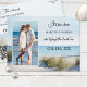 Küste Save the Date Postkarte mit Ihrem eigenen (Verlobung) Foto gerahmt von einem Bild von Dünen über einem Strand und Ozean. Auf der Rückseite befindet sich eine QR-Code-Vorlage.