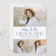 Feiern Sie den Absolventen mit unseren stilvollen Foto-Abschlussfeiern! Die Einladung zur modernen Graduiertenparty zeigt drei der Fotos der Hochschulabsolventen. Die Phrase "Juers to the graduate" wird in trendy marineblau Schriften vorgestellt. Personalisieren Sie die Front der Graduierungseinladungen, indem Sie den Namen des Absolventen, den Namen der Schule und das Abschluss Jahr. Die Einladung kehrt sich um, um Ihre Abschlussfeier Details mit einem lustigen marineblauen blau-weißen Trellis Muster Hintergrund.