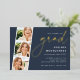 Feiern Sie ihren großen Meilenstein mit diesen schicken Einladungen, die sich perfekt für ein Abschluss-Fest eignen. Luxe Design bietet "grad" in eleganter Goldfolie auf einem reichen marineblau blauen Hintergrund. Personalisieren Sie mit Ihren Party-Details, die rechts in der modernen weißen Schrift ausgerichtet sind. Beenden Sie das Design mit drei quadratischen Fotos des Absolventen in einem Foto Streifen Layout.
