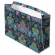 Dieser Geschenksack bietet Blume in lila, blauen und olivgrünen Farbtönen, umgeben von lila Farnfronten und Blätter auf dunkelblauem Hintergrund.
