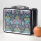 Die Lunchbox bietet Blume in lila, blauen und olivgrünen Farbtönen, umgeben von lila Farnfronten und Blätter auf dunkelblauem Hintergrund.