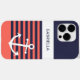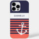 Einfaches zeitgenössisches Schiffsanker auf einem klassischen und schicken marineblau-blauen und hellen sommerlichen pfirsichorangen, korallenroten Streifen Muster. Mit Raum zum Personalisieren oder Anpassen mit einem Namen, Initialen oder Monogramm Ihrer Wahl auf einem weißen Hintergrund. Schönes, modernes und cooles Cover für den Trend-geschickten und kunstliebenden angesagten Trendsetter, künstlerischer Motif-Liebhaber, der will, ihr Handy vor Staub und Schmutz, Abnutzung und Tränen zu schützen. Dieses Design ist erhältlich in Apple iPhone 6, 7, und 8 Plus, 10 oder X, XR, XS, 11, 12, 13 Mini, 14, 15 Plus, und Pro Max Handy Hüllen. Zeigen Sie Ihren Stil, sehen Sie in der Mode und fühlen Sie sich stilvoll mit einem einzigartigen Design auf einem mobilen Zubehör Ihrer Wahl.