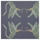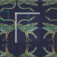 Moderne chinoiserie-inspirierte Stoffe mit stilisierten Aquarellkranvögeln in Schieferblau-Grautönen auf dunkelviolett blauem Hintergrund.
