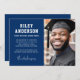 Moderne, dunkelblaue oder benutzerdefinierte Farbe Abschluss Foto-Ankündigungskarte mit Ihrem Foto und den Namen des Absolventen in einem modernen Uni Sportart-Schriftart. Weißer Text auf dunkelblauem Hintergrund. Farben und Schriftart sind im Designwerkzeug anpassbar.
