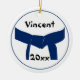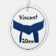 Das einzigartige Martial Arts Dark Blue Belt Dated Round Ornament kann mit dem Namen Ihres Kampfkünstlers und in diesem Jahr personalisiert werden, um zu gratulieren und zu gedenken, einen Gürtel Rank Werbeaktion Test oder Prüfung. Dieses maßgeschneiderte Martial Arts Sport-Ornament verfügt über ein digital erweitertes Foto eines Bluebelt in einem Knoten mit weißem Hintergrund gebunden.