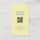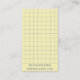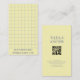 Visitenkartendesign mit einem blassgelben karierten Muster und einem minimalen Layout, mit QR-Code für den schnellen Zugriff auf eine Website oder ein Portfolio. Geeignet für handgefertigte Bekleidungsmarken, kreative Unternehmen oder Boutiquen.