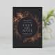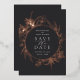 Ein elegantes Save the Date Design, in dem Ihre Hochzeitsdetails in schicken, cremefarbenen Schriften dargestellt werden, umgeben von einem blumigen Rahmen aus Rose, goldgelben Lilien und Blattwerk auf einem schwarzen Hintergrund aus Holzkohle.