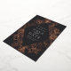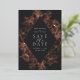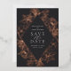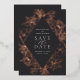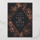 Ein elegantes Save the Date Design, das Ihre Hochzeitsdetails in eleganter, cremefarbener Schrift in einem rautenförmigen geometrischen Element vereint. Ein komplizierter Blumenrand aus Rose, Goldfolienlilien und Pop aus Blattwerk vor tiefschwarzem Holzkohle-Hintergrund.