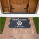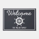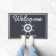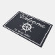 Themed nautischfußmatte, die eine weiße Schiffsrad-/-helm-Silhouette über dunkelgrauem und Ihrem personalisiertem Familiennamen kennzeichnet.