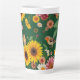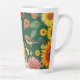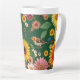 Diese große, latte Tasse hat einen dunkelgrünen Hintergrund mit Blume und Vögeln.