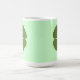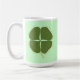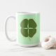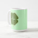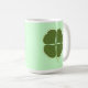 Malerei eines grünen Kleeblatts, vierblättriges Kleeblatt, zentriert in einer Kontur, die von einem vierblättriges Kleeblatt zeichne, auf zwei Seiten einer Tasse gedruckt. Die Hintergrundfarbe kann geändert werden. Um eine andere Hintergrundfarbe auszuwählen, klicken Sie auf Anpassen, dann auf Bearbeiten, dann auf Hintergrund und dann auf die Farbe Ihrer Wahl. Die Farbe Grenze ist die Kantenfarbe.