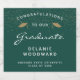 Feiern Sie den Meilenstein Ihres Absolventen stilvoll mit diesen individuellen Abschluss-Schaumweinflaschen-Etiketten, die mit den Worten "Herzlichen Glückwunsch an unseren Absolventen" in weißem Text auf dunkelgrünem Hintergrund. Das Wort "Graduate" erscheint in einem anmutigen Skript im Handschriftenstil. Ein paar goldene Imitate Glitzer Mörtel-Kappen und eine Streuung von Goldkonfetti schmücken den oberen Teil des Etiketts. Personalisieren Sie es mit dem Namen, der Schule und dem Jahr des Abschlusses.