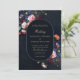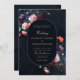 Ein wunderschönes Blumengesteck umrahmt diese atemberaubende Hochzeitseinladung mit einem düsteren romantischen Thema. Ein dunkler mariner Hintergrund und ein abgerundeter Rechteck bilden den Hintergrund für klassische Typografie und Touchs eleganter Kalligrafie in einer goldenen Farbe (digitaler Effekt, nicht echtes Gold). Eine perfekte Wahl für Paare, die die dunkle romanische Hochzeitsvibe Liebe haben. Eine dunkle und launische Hochzeitseinladung, die jede Menge Farbe verleiht und eine große Auswahl an Farben bietet, um einem schwarzen Hochzeitskleid oder einer dunkelblauen Hochzeit zu entsprechen. Elegant und romantisch, ist dies eine moderne klassische Hochzeitseinladung.