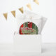 Schöne, einzigartige, klassische, trendige, hübsche und dekorative Weihnachtsgeschenke mit einem klassischen Holiday dunkelrot, waldgrün und weiß gefärbten Zitattext "Frohe Weihnachten" auf einem rustikalen, verwitterten Land Hütte Bauernhaus Stil Plane Hintergrund.