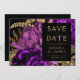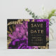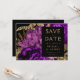 Diese elegante, launische Hochzeit Save the Date-Karte bietet ein üppiges, romantisches Blumenstrauß in violett mit goldener Faux-Folie und glänzendem Blattwerk auf schwarzem Hintergrund. Passen Sie den goldfarbenen Text in stilvollen Schriften auf einem schwarzen Rechteck an, und fügen Sie Ihre Website-URL zu dem soliden schwarzen Rücken.