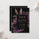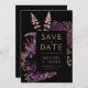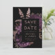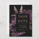 Diese elegante, launische Hochzeit Save the Date-Karte bietet ein üppiges, romantisches Blumenstrauß in violett mit rosa goldener Faux-Folie und glänzendem Blattwerk auf schwarzem Hintergrund. Passen Sie den rosa rosa Text in stilvollen Schriften auf einem schwarzen Rechteck an, und fügen Sie Ihre Webseite URL zu den soliden schwarzen Rückseite.