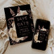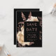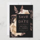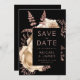 Diese elegante, launische Hochzeit Save the Date-Karte bietet ein üppiges, romantisches Blumenstrauß in Elfenbein mit Rose Gold Imitate Folie und Glitzer Blattwerk auf einem schwarzen Hintergrund. Pinkfarbener Rose-Text in stylischen Schriftart auf einem schwarzen Rechteck, und fügen Sie Ihre Hochzeitswebsite-URL zu den soliden schwarzen Rücken.