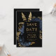 Diese elegante, launische Hochzeit Save the Date-Karte bietet einen üppigen, romantischen Blumenstrauß in Marineblau mit goldenen Imitate-Folie und Glitzer-Blattwerk auf schwarzem Hintergrund. Passen Sie den goldfarbenen Text in stylischen Schriftart auf einem schwarzen Rechteck an und fügen Sie die URL Ihrer Hochzeitswebsite zum schwarzen Schwarz-Rücken hinzu.