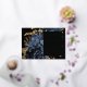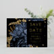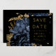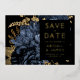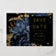 Diese elegante, launische Hochzeit Save the Date-Karte bietet einen üppigen, romantischen Blumenstrauß in Marineblau mit goldenen Imitate-Folie und Glitzer-Blattwerk auf schwarzem Hintergrund. Passen Sie den richtigen Goldfolientext in stilvollen Schriftart auf einem schwarzen Rechteck an und fügen Sie Ihre Hochzeitswebsite-URL zum schwarzen Schwarzen Rücken hinzu.