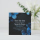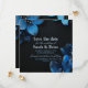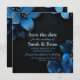Dunkle Hochzeit speichern Sie das Datum mit blauen Blumen und Glitzer.