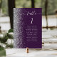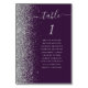 Der links Rand dieser eleganten modernen Hochzeitskarte weist eine silberne Imitat-Glitzer-Grenze auf. Das Wort "Tabelle" erscheint in silbergrau whimsical Handschrift Skript auf einem dunklen lila Hintergrund. Fügen Sie die Namen Ihrer Gäste hinzu, die jeder Tabelle zugeordnet sind.
