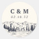 Rustikale Chic-Aufkleber für Ihre Outdoor-, Wald- oder Abenteuerhochzeit bieten eine handgezeichnete Darstellung von Berggipfeln, Kiefern und einem fließenden Fluss, mit Ihren Initialen oder Monogramm und Hochzeitstag in Blockschrift.