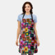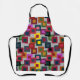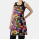 Diese Schürze hat ein geometrisches Design von Quadraten in braun, schwarz, ziegelrot, gelb, aquamarin, grün, lila, gelb, goldgelb, rosa, rot, grau auf einem leichter grau.