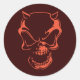 Beängstigender roter Schädel mit hohlen Augen und Teufelshornen, die in der Dunkelheit grinsen. T - Shirt, Schweiß, Drucke, Geschenke.