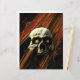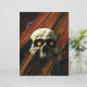 Böser Schädel mit leuchtenden Augenhöckern und dunklem Hintergrund mit Streifen in Orange, Maron und Schwarz. Glückliches Halloween, Sterbliche.