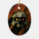 Böser Schädel mit leuchtenden Augenhöckern und dunklem Hintergrund mit Streifen in Orange, Maron und Schwarz. Glückliches Halloween, Sterbliche. (Hinweis: Ähm.. die Augen leuchten nicht wirklich.)
