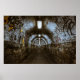 Dunkler Untergrund-Tunnel mit Graffiti an den Wänden.