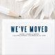 Dunkelblau "Wir haben uns bewegt" in einem fett gedruckten Schriftart mit Namen und Adressangaben unten