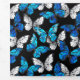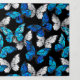 Realistisches, blaues und weißes Schmetterlingsmuster auf schwarzem Hintergrund.