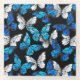 Realistisches, blaues und weißes Schmetterlingsmuster auf schwarzem Hintergrund.