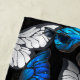 Realistisches, blaues und weißes Schmetterlingsmuster auf schwarzem Hintergrund.