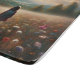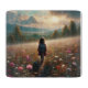 Das Kunstwerk zeigt ein junges Mädchen, das durch ein riesiges, farbenprächtiges Feld von Blume geht, das sich bis in die ferne Gebirgswelt erstreckt. Sie trägt einen Rucksack und einen Mantel, was ein Gefühl für Abenteuer und Erkundung nahe legt. Der Himmel ist dramatisch mit einer Mischung aus Wolken und Sonnenlicht, die ein goldenes Licht über die Landschaft wirft. Bäume in der Ferne geben der Szene Tiefe, während der Weg, auf dem sie geht, im warmen, sanften Licht von Morgengrauen oder Dämmerung gebadet wird.