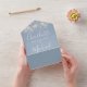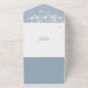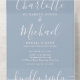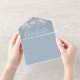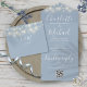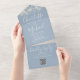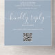 Alles in einer Hochzeitseinladung mit hübschen Saitenlichtern, prächtigen Stilnamen und schicker Typografie auf staubblauem Hintergrund. Die Einladung enthält eine perforierte RSVP-Karte mit QR-Code. Entwickelt von Thisisnotme©