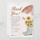Zeigen Sie Ihre Wertschätzung mit diesem Boho April Duschen Bringen Mai Blume Babydusche Dank Karte! Mit einem charmanten Aquarelldesign aus Regenstiefeln mit Sonnenblumen, einem weichen Schirm und zarten Schmetterlingen fügt diese Karte Ihrer Dankbarkeit eine skurrile und herzliche Touch hinzu. Ideal für eine boho-, rustikale oder Spring-Theme Babydusche, ist es eine schöne Art, Ihren Gästen für ihre Liebe und nachdenkliche Geschenke zu danken!