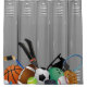 Der Duschvorhang im Locker Room Design mit einem Haufen Sportgeräte vor einem Set von Schließfächern.