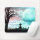Gotisches Gefühl, aber mit weicher, heller Energie : launischer, dunkler Friedhof mit Vögeln, die große Vollmond-Totenzweige fliegen
