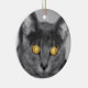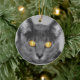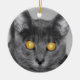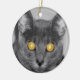 Ein Foto, das direkt in das Gesicht einer grauen Katze mit golden leuchtenden Augen schaut. Hergestellt mit selektiver Färbung zur Betonung der faszinierenden Augen.