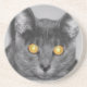 Ein Foto, das direkt in das Gesicht einer grauen Katze mit golden leuchtenden Augen schaut. Hergestellt mit selektiver Färbung zur Betonung der faszinierenden Augen.