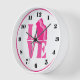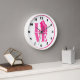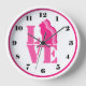 Deklarieren Sie Ihre Liebe für Katzen mit dieser modernen, einfachen Uhr, die einen zeichn einer dunkelrosa Katze hat, die in Silhouette sitzt, mit rosa Schatten dahinter. Die Katze bildet das "O" des Wortes LIEBE, das in großen rosa Schablonenbuchstaben geschrieben ist. Die Uhr hat einen weißen Hintergrund, schwarze Zahlen und einen koordinierenden dunkelrosa Rahmen.