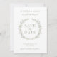 Erleben Sie Eleganz mit dieser eleganten und modernen rustikalen Save the Date-Einladung, die mit Blätter aus Aquarell und zarten Blüten aus weißer Blume in einem zarten Kranz geschmückt ist. Die Einladung wird mit dem Foto eines Paares auf der Rückseite individuell gestaltet.