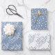 Dusty blau-weiße Weihnachtstypografie und dots Urlaub Wrapping Paper Sheets. Das erste Blatt enthält den Text "Frohe Weihnachten" in weiß auf staubblauem Blau, das zweite weiße Polka Punkte auf blau und das dritte den Text "Frohe Weihnachten" in blau auf weiß.