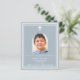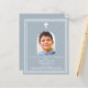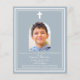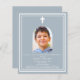 Blauer Hintergrund mit weißem Rahmen und weißem Kreuz Persönlich gestalten und ein Foto mit Details hinzufügen. Weißer Text. Bogenförmiger Rahmen aus Foto 1 Blatt = 1 Einladung mit Druckkante bis Kante.
