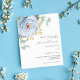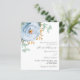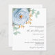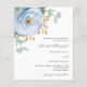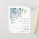 Ein schick weißer Hintergrund. Dekoriert mit einem staubigen blauen Blumen, Rose Blume und grünen Aquarellblüten Eukalyptus-Blätter, Sprigs, Grünpflanzen und Imitaten goldenen Zierpflanzen. Personalisieren und fügen Sie Ihre Namen und Hochzeitsdetails. 1 Blatt = 1 Einladung mit Druckkante bis Kante.