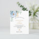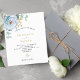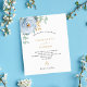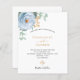 Ein schick weißer Hintergrund. Dekoriert mit einer staubigen blauen Blume, Rose Blume und grünen Aquarellblüten Eukalyptus-Blätter, Sprigs, Grün und einem Imitat goldenen Sprig. Personalisieren und fügen Sie Ihre Namen und Hochzeitsdetails. Schwarze und goldfarbene Buchstaben. 1 Blatt = 1 Einladung mit Druckkante bis Kante.