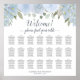 Diese elegante Sitzkarte bietet Platz für 210 Gäste an 21 Tischen mit jeweils 10 Plätzen. Das Diagramm zeigt eine bohemianisch-schicke Ästhetik mit handbemalten Aquarellfarben-Rose, Blume und Blüten in sanft staubblauen Farbtönen, schlängelgrünen Eukalyptus-Blätter und einer Vielzahl von Gartenblättern. Der Titel des Diagramms, geschrieben in zarter kursiver Kalligraphie, lautet "Willkommen! Bitte suchen Sie Ihren Tisch." Das Diagramm enthält auch Leerzeichen für die Namen des Paares und das Datum der Hochzeit. Es dient als eine schöne Möglichkeit, die Gäste zu empfangen und ihnen den Zugang zum Empfang zu erleichtern.